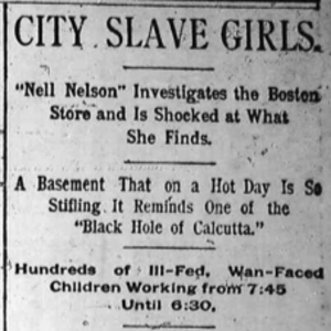 For dismal surroundings, economy of comforts, and heartless treatment, to the Boston store belongs the palm. I did not work in that establishment although I tried very hard to do so. I was in the store at 8 o'clock on Friday morning as arranged with Mr. Hillman, who had partially promised to hire me. "One of the girls in the hoisery department," he had said "is sick, and if she doesn't come back Friday morning I will try you." I could not find the gentleman, although I hunted the main floor and the floors above and below. My plan of fluctuation was to take the elevator up one story and walk down, and then ride up two and walk down the third flight, in that way I took in the entire store and a great part of the employees. I began at the bottom and spent a full hour in the basement, where I saw so much and suffered so much that the upper floors had no surprised for me. In the first place the atmosphere was almost unendurable. Hot! It must have been 100 degrees above! Out in the open air not a breeze was stirring and the heat was sizzling. Down where I was I could not see a single opening to admit the air, firey as it was, excepting the open door at the extreme south-east corner of the floor, leading up a short flight of steps to the sidewalk.