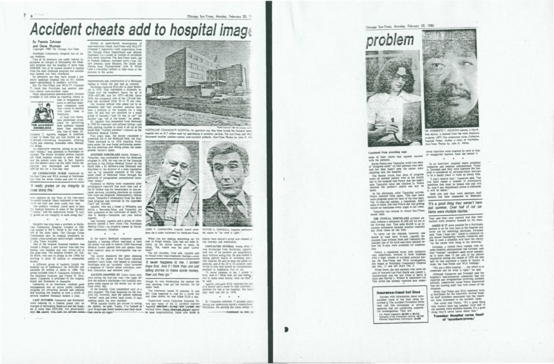"Northlake Community Hospital has an image problem. "Two of its directors are under federal indictment on charges of defrauding the Medicare program and the hospital of more than $350,000. One of its busiest doctors is banned from the state Medicaid program and another was banned and reinstated. "Its operators say they have turned a formerly bankrupt hospital into an $11 million asset - specializing in podiatry services. "But the Sun-Times and WLS-TV (Channel 7) found that Northlake has another sideline -- phony auto-accident cases . . . ". . . An undercover reporter, posing as an accident 'victim' was admitted to Northlake by [Dr. Noberto T.] Agustin. The doctor invented serious injuries and fixed hospital records to show that he saw the patient every day. In fact, Agustin saw the patient once -- on the night before the reporter was discharged and handed a $697.30 bill for a four-day stay. . . ."
