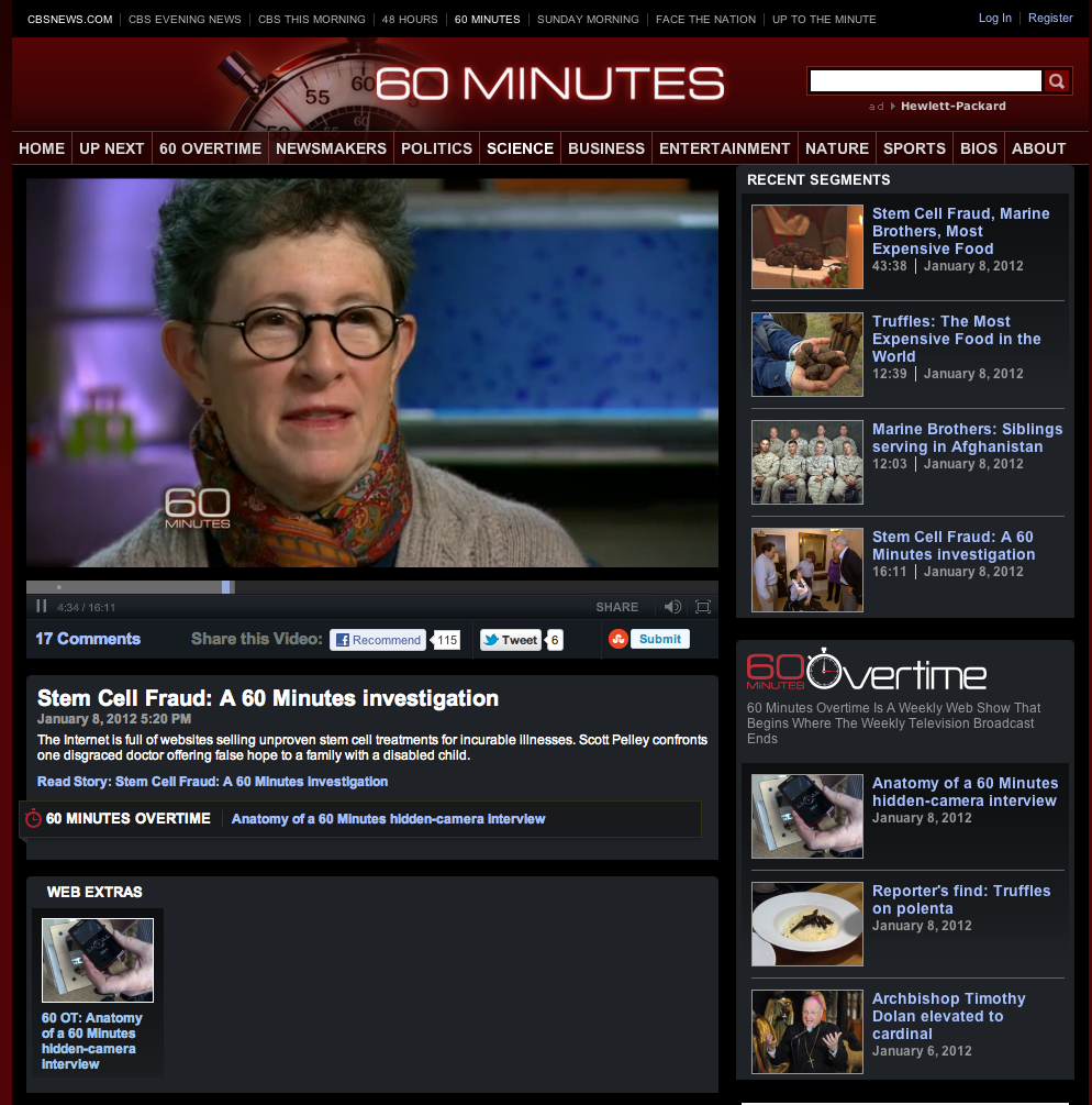 Article LinksDescription:Rare, major CBS News "Sixty Minutes" investigation of stem cell hucksters abroad who claim to help those with illnesses for which there is no known cure. The program used hidden cameras and telecom to investigate.