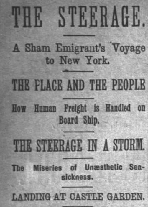 "The words look up at me from a crumpled ticket which lies on my desk. On the reverse side I read in English, German, Swedish, French and Italian: "Keep this card to avoid detention at quarantine and on railroads in the United States." This small document was my passport from under the folds of the Union Jack tot he shelter of the Stars and Stripes. I have emigrated. Unlike most emigrants, I went from New York to Liverpool for the expressed purpose of emigrating. The desire was on me to cast in my lot with a shipload of human freight: to experience in my own person, the adventures, sad or merry, to test the treatment, good or bad, accorded those who leave home and country to lie down in the steerage, awake in Castle Garden and be whirled westward across the plains.