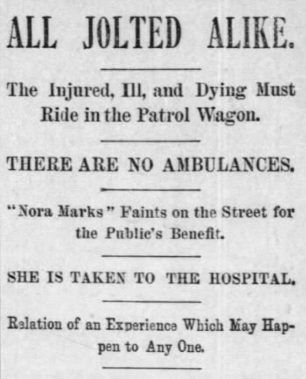 "I have had a free ride in the patrol-wagon. This statement will probably convey the impression that I have been doing something to be "taken up" after the fashion of teh usual occupants of the city's free conveyances. In reality I have done nothing worse than to fall suddenly ill on the street, a crime that 2,000 or 3,000 innocent people commit every year in the City of Chicago. If there had been a city ambulance I should have been entitled to ride in that. It happened in this way:"